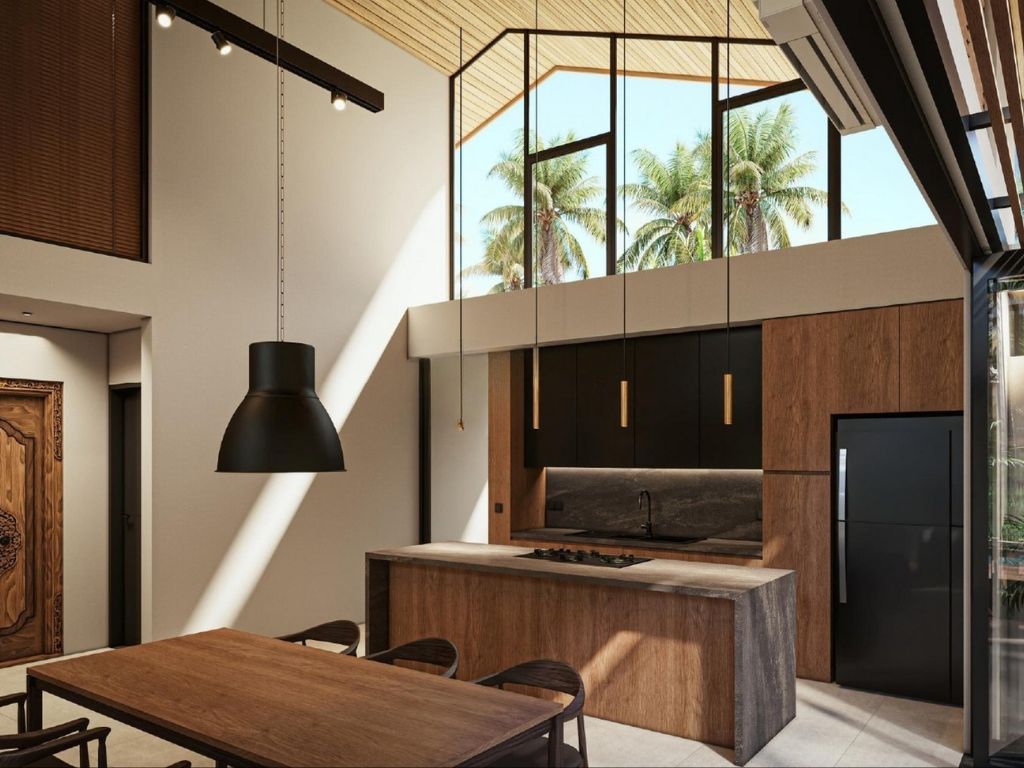 Designed across two levels, each villa offers three bedrooms, with two on the ground floor and a private master suite upstairs, creating a perfect balance between privacy and shared living. The open-plan living, dining, and kitchen area boasts soaring 7-meter ceilings, flooding the space with natural light and seamlessly connecting indoor and outdoor living. Large glass panels open directly onto a private rectangular swimming pool measuring 6.3m x 2.9m, framed by landscaped greenery and captivating rice field views.