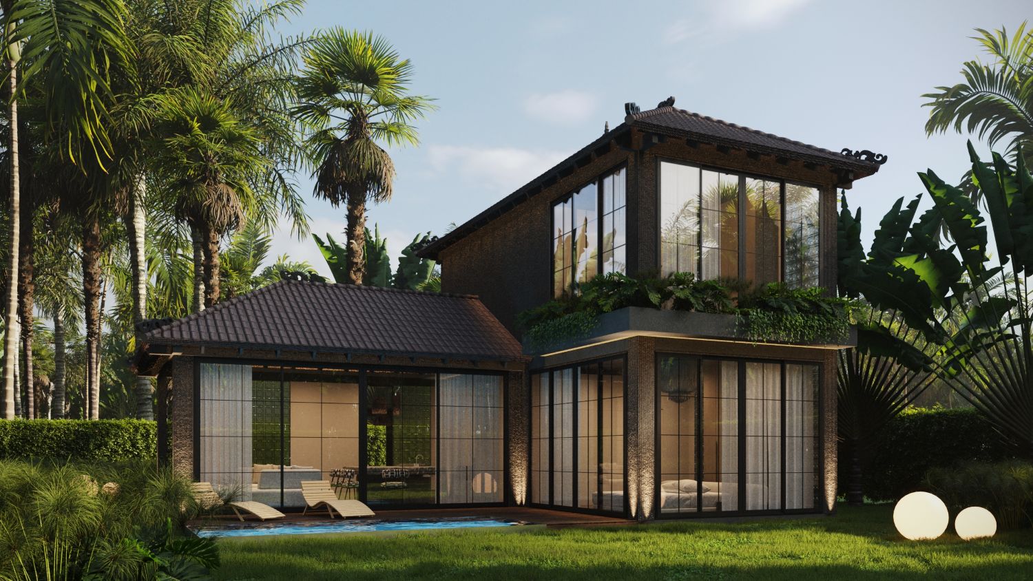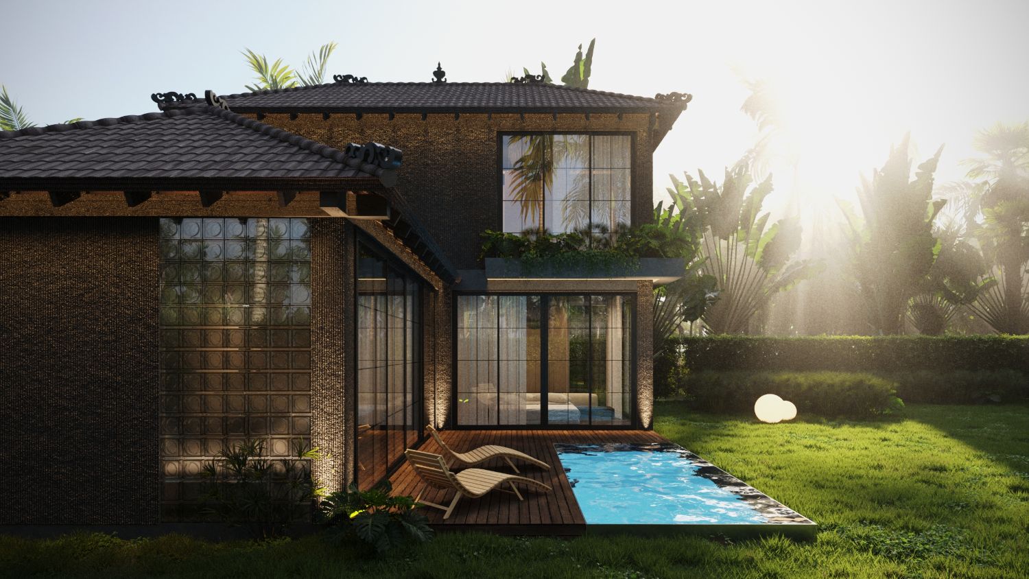 Outdoor Area: Private swimming pool, landscaped garden, and seating areas perfect for tropical living.
