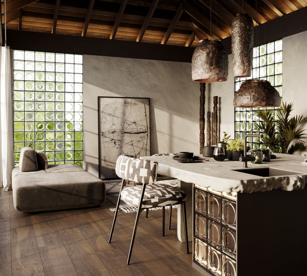 Interior Design – Living Room: Stylish, open-plan layout with high ceilings and natural light, blending modern elegance with Balinese touches.